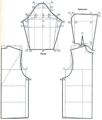 Куртка-ветровка конструируется со спущенной проймой и, как правило, с капюшоном. На основе базовой конструкции куртки можно построить рукав со спущенной на любую величину проймой. Построение спинки АВ = величина углубления проймы. (Пример: 9 см. Подробнее...